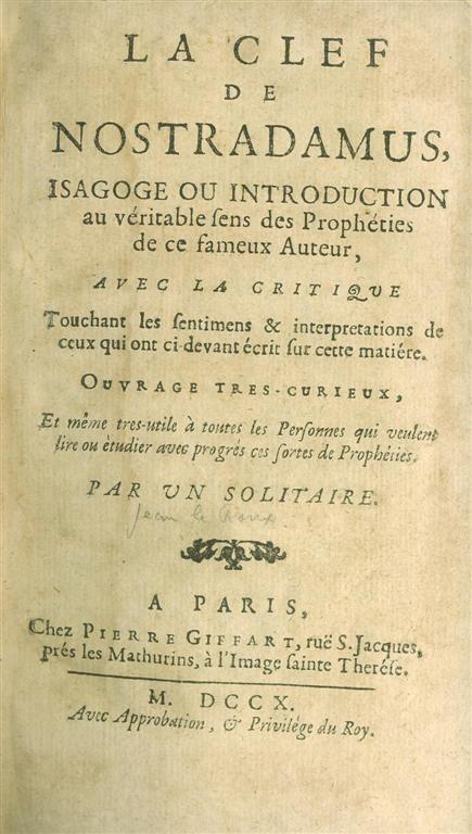 LA CLEF DE NOSTRADAMUS, ISAGOGE OU INTRODUCTION au véritable sens des Prophéties de ce fameux Auteur, AVEC LA CRITIQUE Touchant les sentimens & interprétations de ceux qui ont ci-devant écrit sur cette matiére.OUVRAGE TRES-CURIEUX, Et même très-utile à toutes les Perfonnes qui veulent lire ou étudier avec progrés ces fortes de Prophéties. PAR UN SOLITAIRE./